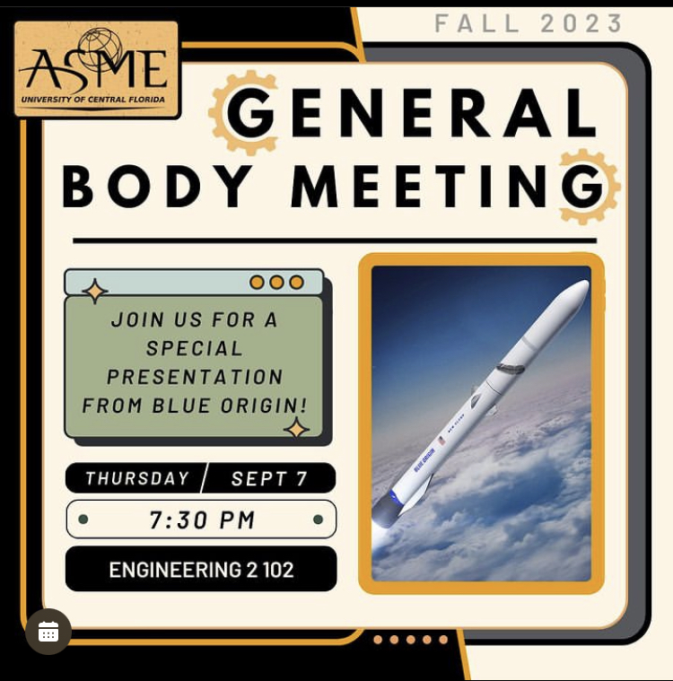 Good afternoon members. ASME at UCF is hosting its first GBM this Thursday, September 7th, 2023 at 7:30 PM in Engineering 2 room 102. You won’t want to miss this GBM. We are proud to be hosting a presentation by a representative of Blue Origin, a major player in the aerospace field. We will also be announcing all of the projects for this semester, as well as getting you up to date on all things ASME. And as always, stay until the end for free pizza! We look forward to seeing all of you there.